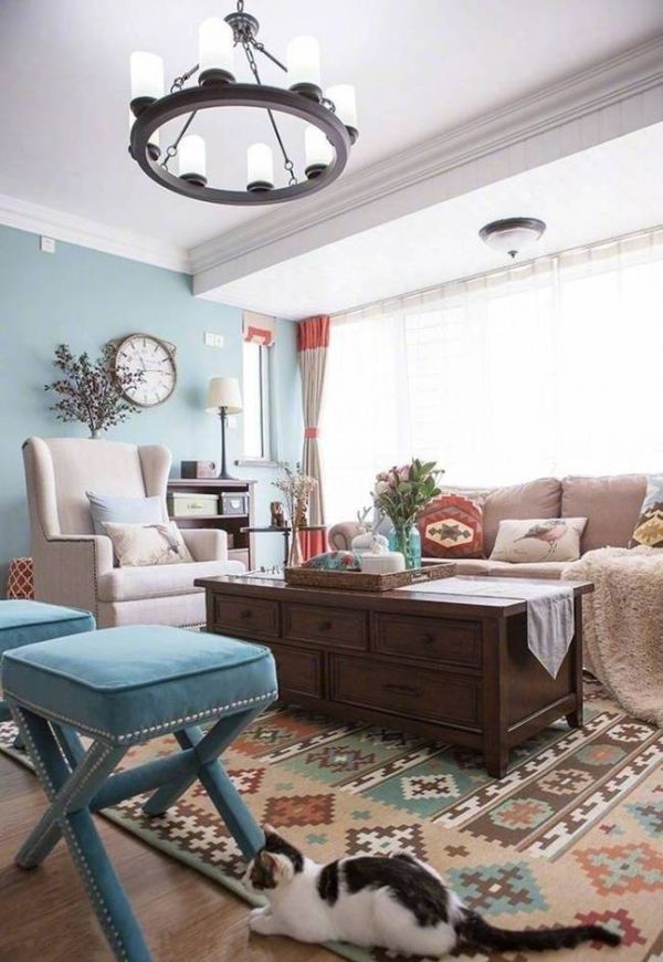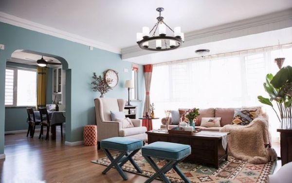 沙发是米色的沙发,两张浅蓝色的沙发椅,以及深木纹的茶几构成整个沙发区,而且沙发背后的墙面做了收纳柜,室内用了不少的装饰品做了简单的装饰,特别的复古气息。