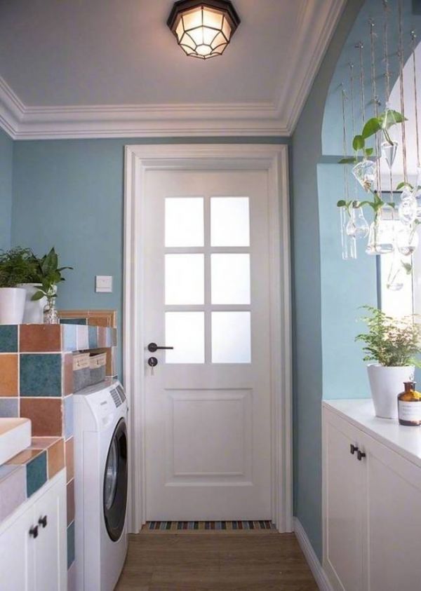 厨房过来就是卫生间了,卫生间做了干湿分区的设计,浴室柜以及洗衣柜都设计在卫生间的外面,因为整个空间足够大,而且柜子的收纳以及洗衣柜都是直接用复古的彩瓷做装饰铺贴,而旁边的柜子做了半墙柜的设计,过去就是餐厅了。