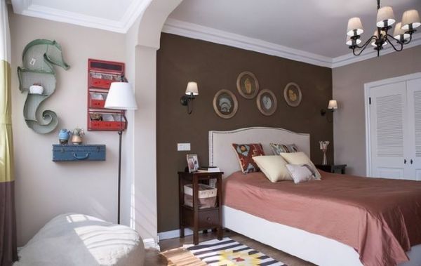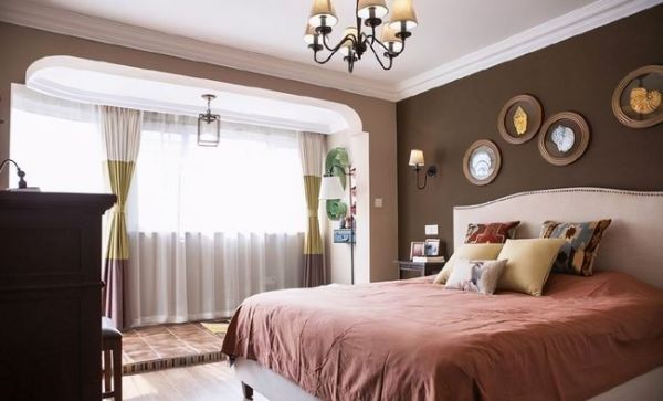 卧室,背景墙做了褐色的处理,然后用装饰品做了简单的装饰,白色的床以及床头柜搭配,衣柜直接是内嵌在墙内的,充分利用空间,而且卧室内的阳台和室内空间打通,整个空间显得更为宽敞,采光也非常好。