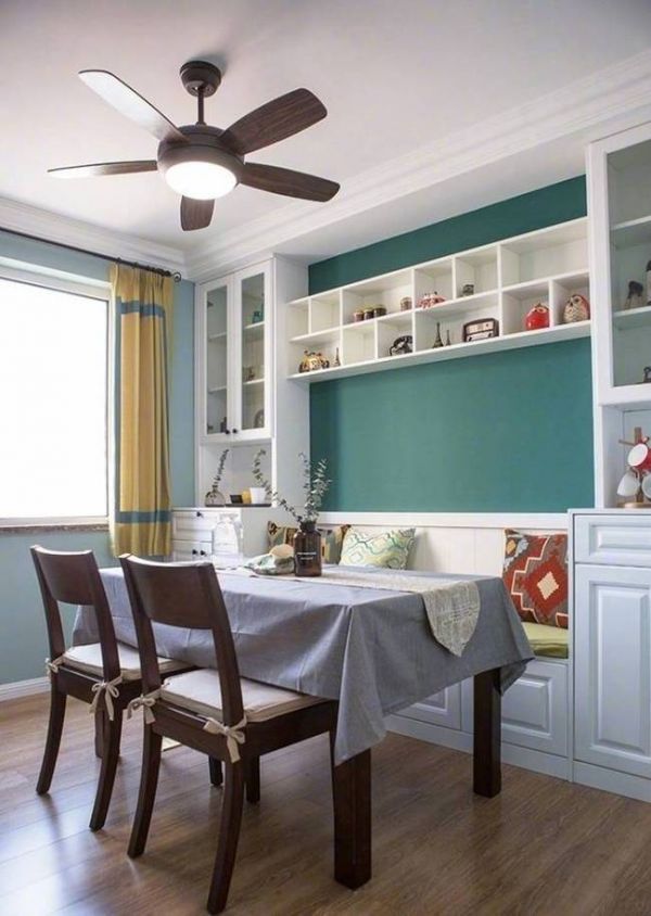 餐厅,利用整面墙做了卡座的餐椅,以及餐椅背后的空间做了收纳柜的设计,整个柜子的收纳空间超大,而且卡座底端的空间也做了收纳的处理。