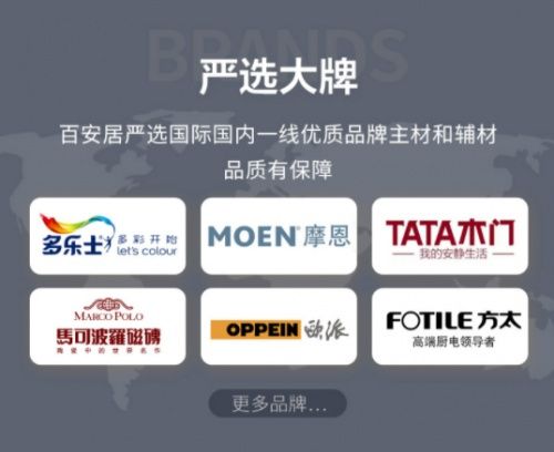 通过深耕家装行业多年的探索和实践,百安居逐步建立了强大的产品B端供应链,并与众多国内外一线大牌达成合作,精选严控,致力为消费者带来质量把控更严格、品类更齐全的家装服务。