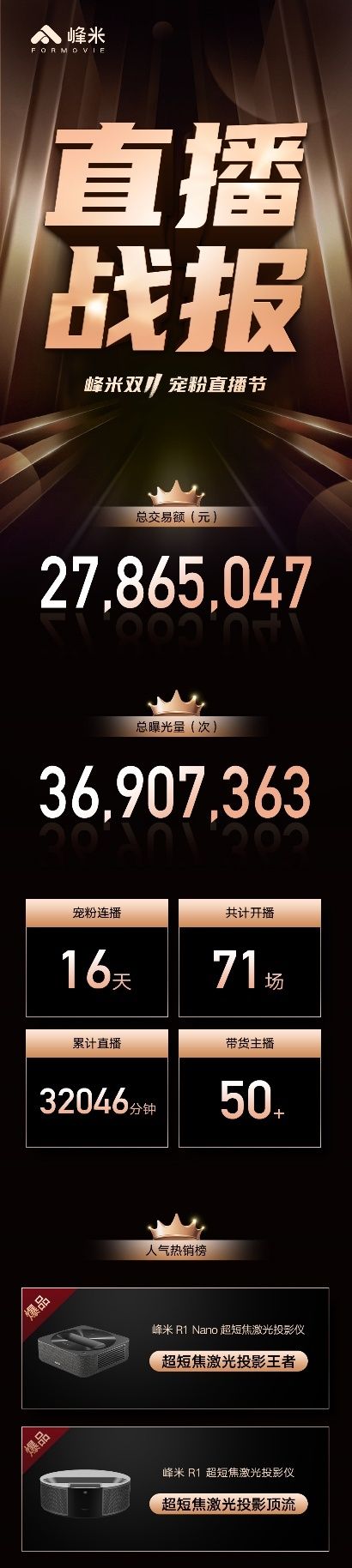 峰米双十一宠粉直播节完美收官,总销售额突破2780万元