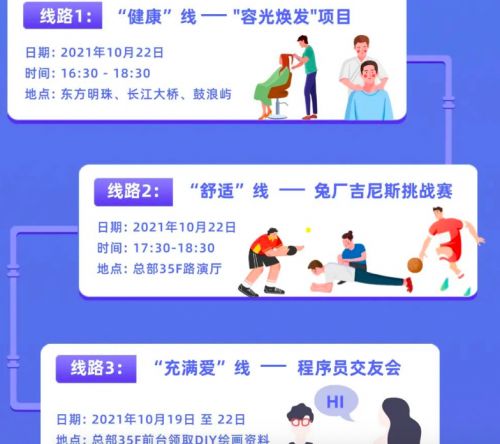 先给大家看看我们福利part。因为我是技术岗,所以还能享受10月24日的程序员节的福利。兔厂在这天给我们准备了一场主题派对,主题就是让家健康,舒适,充满爱。活动内容和形式还是很丰富的,比如说有容光焕发项目、兔场吉尼斯挑战线和程序员交流会等等,基本涵盖了我们日常的生活起居、运动还有社交方面。
