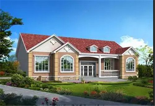 图片描述:这款房屋设计非常适合老人家居住,一层的设计,既方便老人活动,又能满足居住需求,淡黄色的文化砖+红色的瓦片,让房屋色彩更加的丰富。前面的走廊、多窗设计,则可以让室内采光和通风效果更好,居住起来更舒适。