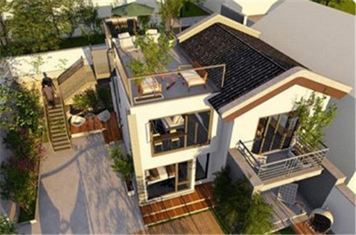 图片描述:这款房屋采用了现代的设计风格,立面以白色为主,再搭配上大面积玻璃,则能营造出通透干净的气息。屋顶采用平屋顶+双坡屋顶的搭配,看起来非常的时尚。在庭院一侧设有楼梯,可直通平屋顶,方便业主晾晒衣服或欣赏室外美景所用。