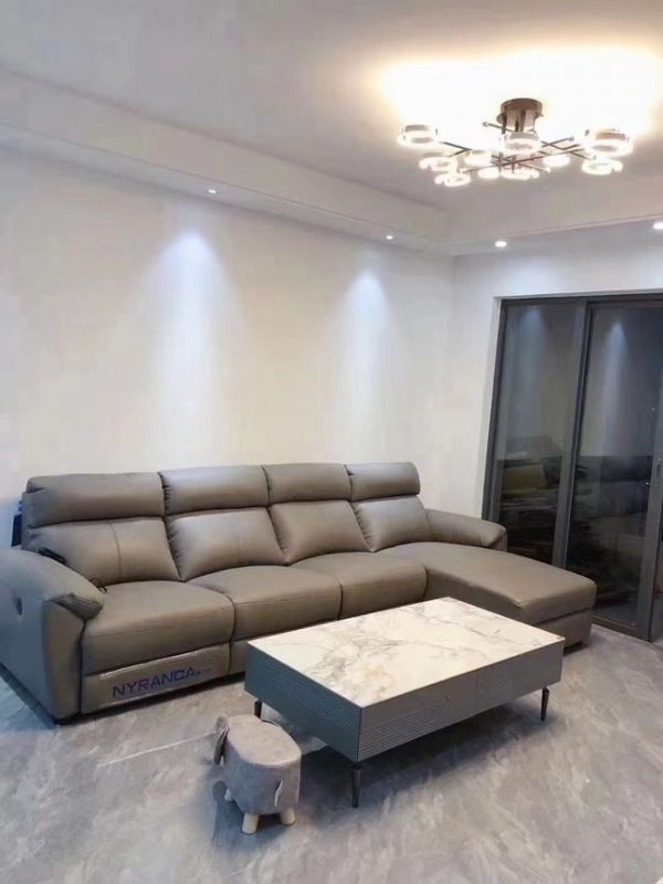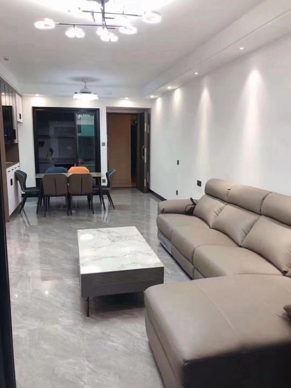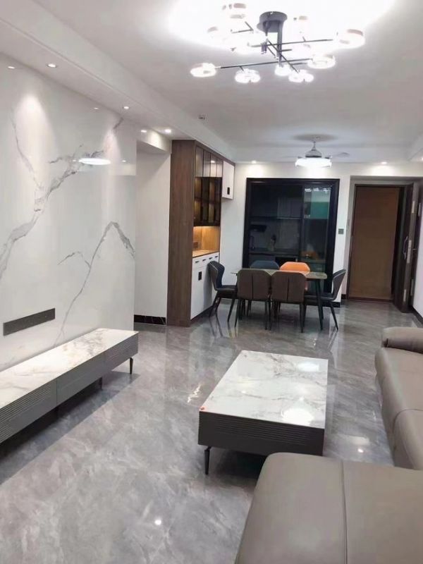沙发背景墙没有任何装饰,后期业主买的挂画到了之后可以用来点缀空旷的墙面,皮质沙发配以仿大理石茶几,简约又时尚。