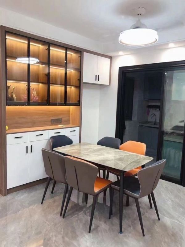 餐厅这里是业主最满意的地方,利用墙体做了餐边柜,中间镂空留有插座,平时放东西和充电烧水都特别方便,柜子内部不忘做灯带既是照明也起到了装饰作用。