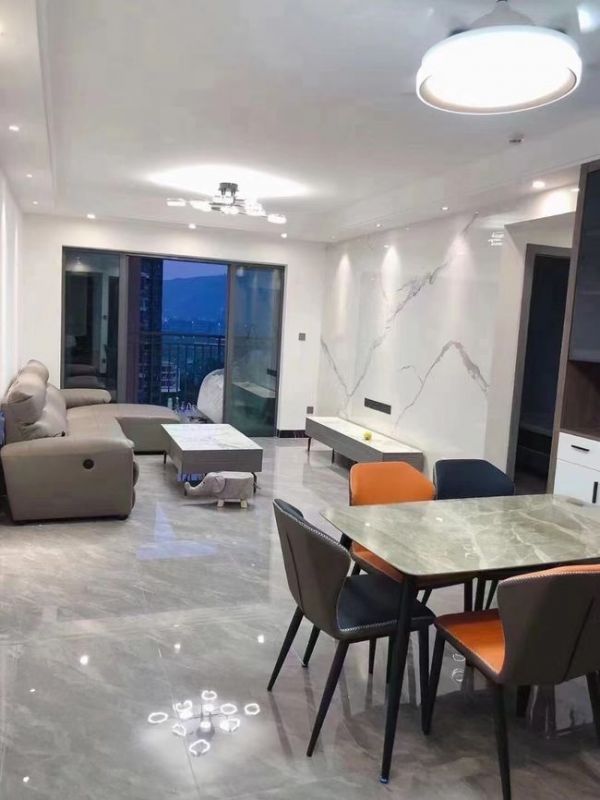 客餐厅地面通铺灰色地砖,与大白墙相呼应,整个空间明亮又大气。