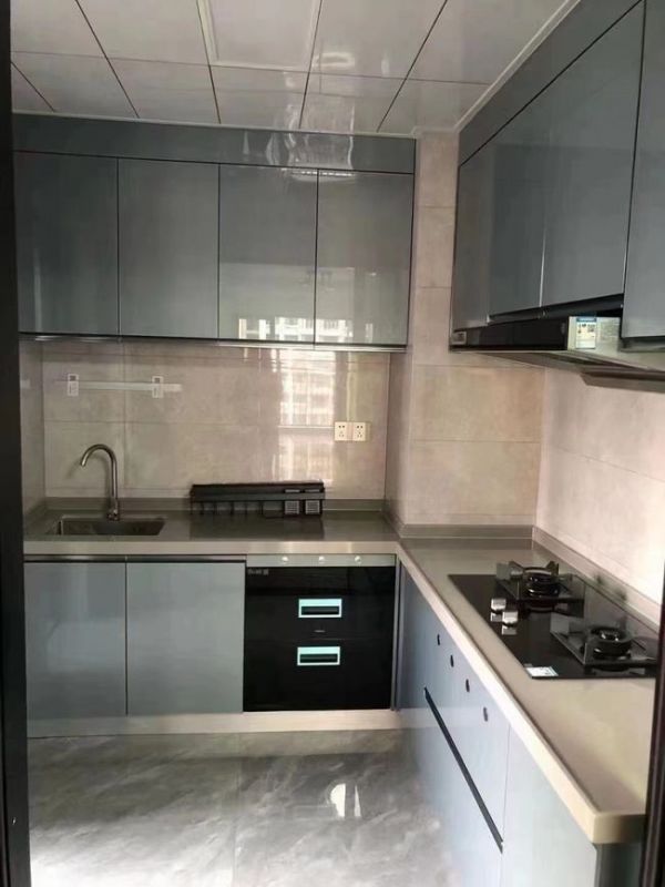 进门左手边就是厨房,延续客厅的灰色瓷砖铺贴地面,米色墙砖+灰色橱柜,整个厨房干净整洁,色彩简单大气。