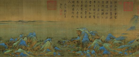 欧神诺境·宫-山川绣系列的创作灵感,源自故宫博物院的馆藏文物绢本设色画《千里江山图》。此图由北宋·王希孟所作,以石青、石绿等矿物质为主要颜料,敷色夸张,以绚丽的色彩、工细的笔致表现出祖国山河的雄伟壮观。
