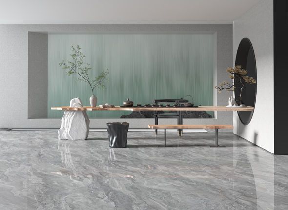 黛山青是山川绣系列的主打色之一,渐变线条明亮素雅,勾勒出绵延雄秀、高低起伏的山峦。绢布基底气韵汩汩而出,人文与自然的交融气质若隐若现。设计师经过反复调试、灵感再创,使瓷砖颜色无限接近画中水墨丹青的色彩,色系丰富、色域宽广、色彩细节过渡和谐,色如宝石之光彩照人,赋予装饰空间独特的色彩艺术价值。