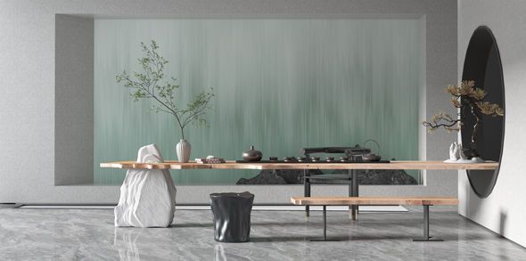 山川绣系列表面为10°-35°哑光,尺寸800X2600mm,一石六纹理(定位连纹),使得整体纹理磅礴细腻、动静结合、意态生动,完美诠释空间壮阔大气的别样魅力,能轻松驾驭各种空间风格,比如当下热门的现代简约风格、新中式风格、混搭风格都能适配。