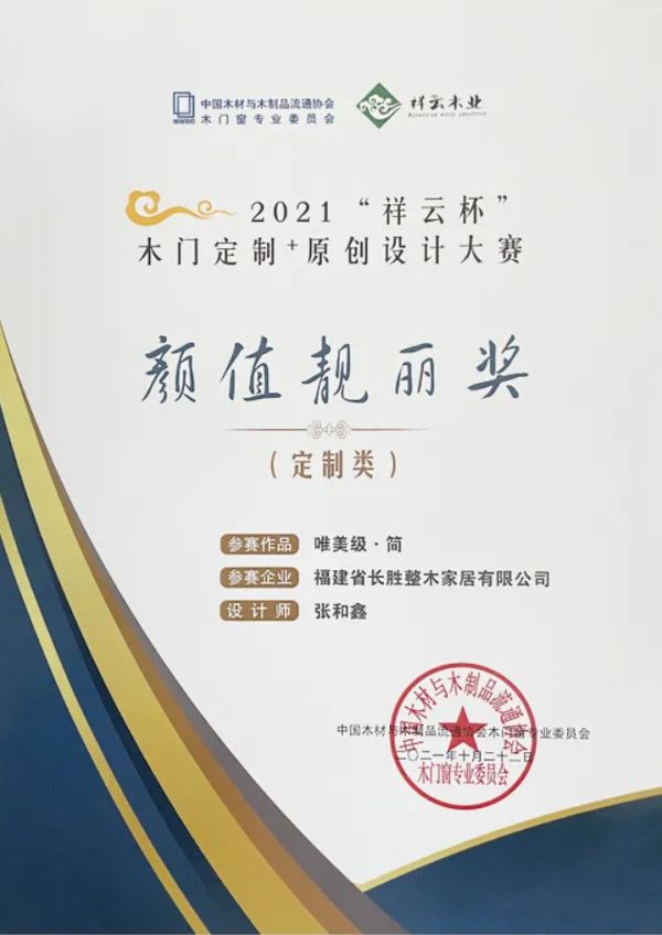 10月22日,由中国木材与木制品流通协会主办,2021年中国木门窗企业家峰会暨中国木材与木制品流通协会产业链分会成立大会在山东滕州盛大召开。会上,富友长胜“唯美级·简”系列产品荣获2021“祥云杯”木门定制+原创设计大赛颜值靓丽奖。