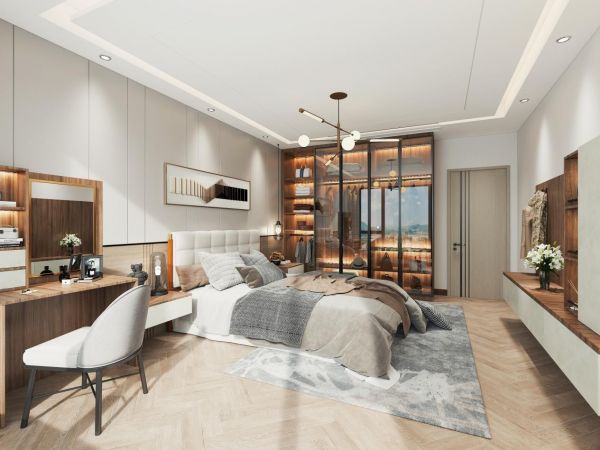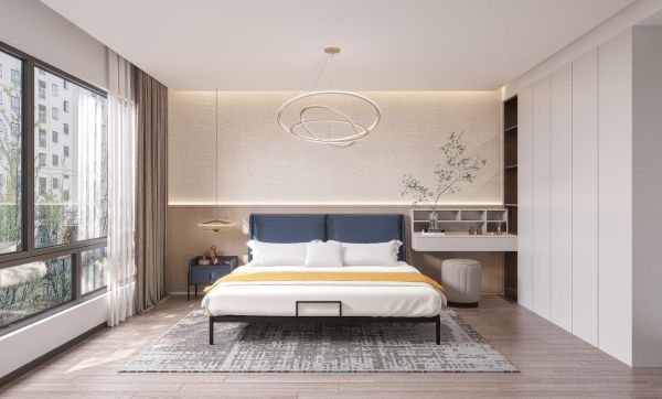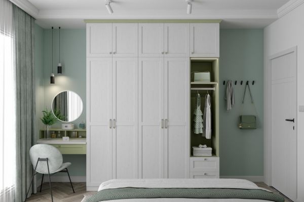 2.除了内嵌式设计,还可以从衣柜转角处延展出悬空式梳妆台,不仅可以保证基础的梳妆收纳功能,还能作为床头柜辅助收纳,手一抬就能放置手机、书本,非常方便,与衣柜风格也能保持和谐统一,是非常适合小户型卧室的设计。