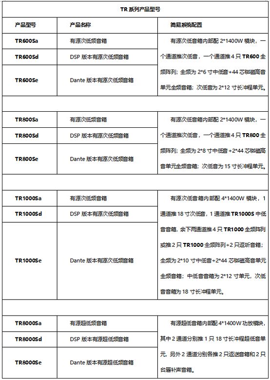 TR系列中的超低频音箱系列,高效率的带通式超低音音箱内装大口径低音驱动单元,搭载先进的单元设计技术,为TR系列带来充沛的低频能量;TR系列的全频音箱由大尺寸低音单元和44芯数高音单元组成,采用同轴线声源技术,将高音单元与低音单元位于同一轴线,形成同轴结构的扩声方式,精准的单元内部布局契合线声源阵列设计原理,实现精确及对称的恒指向波导覆盖,同时满足线声源的准确定位,能够在试音区域呈现高品质音色和极佳的声音清晰度。