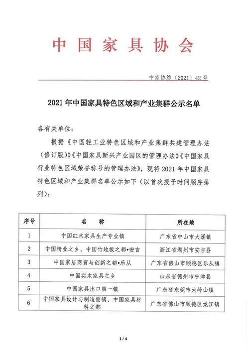 11月18日,中国家具协会发布了2021年中国家具特色区域和产业集群公示名单。名单如下: