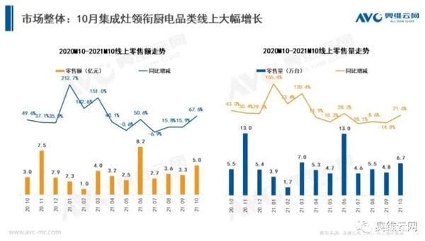 不仅1-9月,根据奥维云网(AVC)线上推总数据显示, 集成灶10月零售额依然保持增势,同比大幅上涨67.6%;零售量同比增长21.6%。线下表现,零售额、零售量同比分别提升38.1%和22.4%。集成灶重新回归全线增长风格。