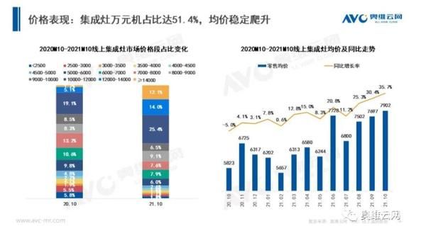 整个10月,在产品结构升级为主的带动下,集成灶线上高端市场结构性占整体市场51.4%,万元机占比较前几月再提升;均价达到7902元每台,同比大幅上调35.7%。