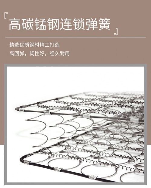 床垫采用2.35线高碳锰钢连锁弹簧,经过8万次耐久性,2次高温热处理和过油防锈处理,弹性韧性好,经久耐用。