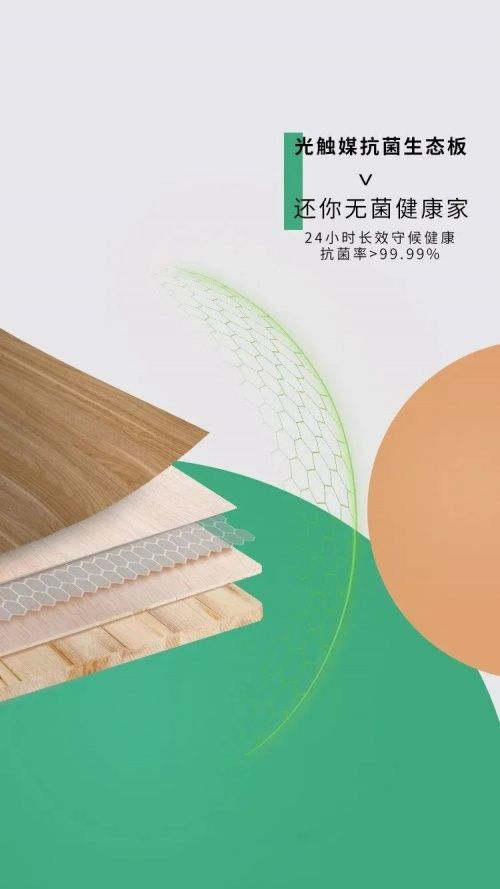 为了满足大众健康抗菌的需求,千年舟研发出光触媒抗菌板、天然豆香抗菌生态板等产品,在保留家居产品基础功能同时,也增强了其健康抗菌的功能。这两类产品都使用了千年舟独家专利技术——新一代纳米光触媒技术,具有环保无毒、消毒杀菌等特性。该技术的科学原理即是,在光照条件下,可使空气产生电离,损伤空气中细菌细胞膜,抑制和分解细菌蛋白质的合成,从根源处将有害物质分解成无毒无害的二氧化碳和水。