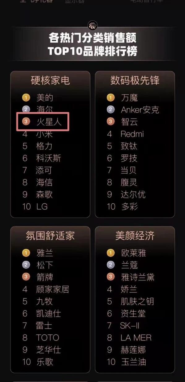 在热门分类销售额T10品牌排行榜上,我们看到了家电、数码、化妆品、宠物、零食等多个大家购买频次最高的类目榜单,也能从中看到诸多耳熟能详的品牌名。在“硬核家电”榜单中,火星人赫然在列,冲入前三。