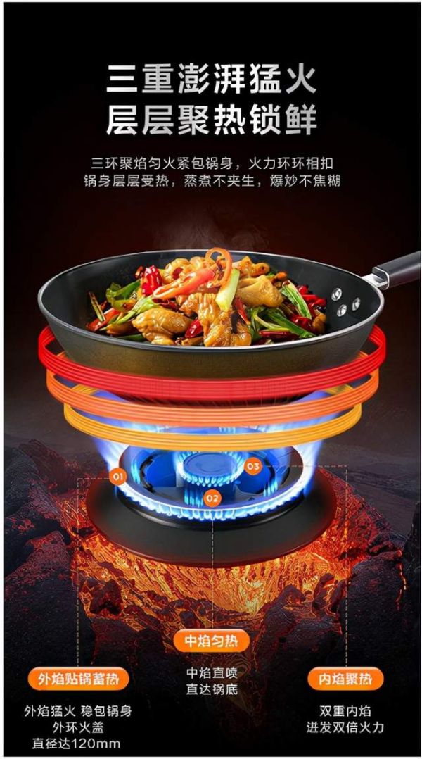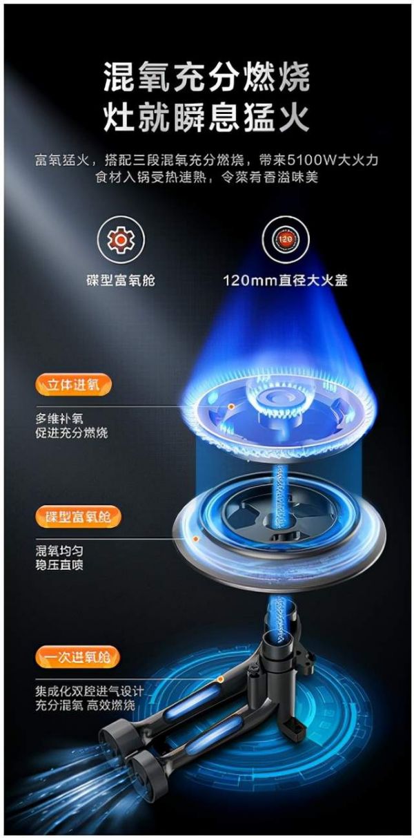 猛火离不开“充分燃烧”的帮助,众所周知,燃气灶蓝色火焰代表着燃气得到了充分燃烧。想要实现燃气充分燃烧,在短时间内产生更多有效热值并节省烹饪时间,燃气和氧气的预混合就非常重要。