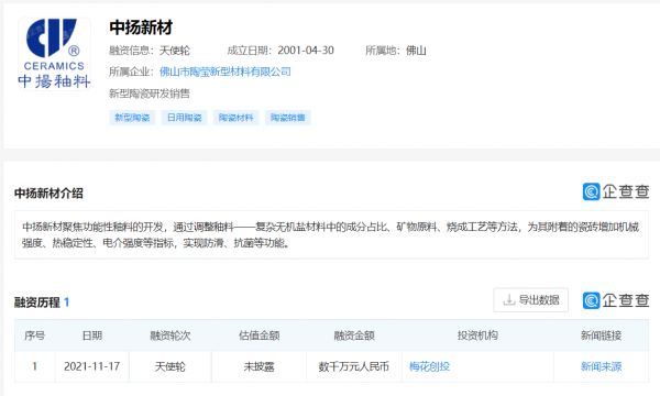 陶卫快讯 | 为陶瓷赋予功能属性,「中扬新材」获梅花创投数千万天使轮融资