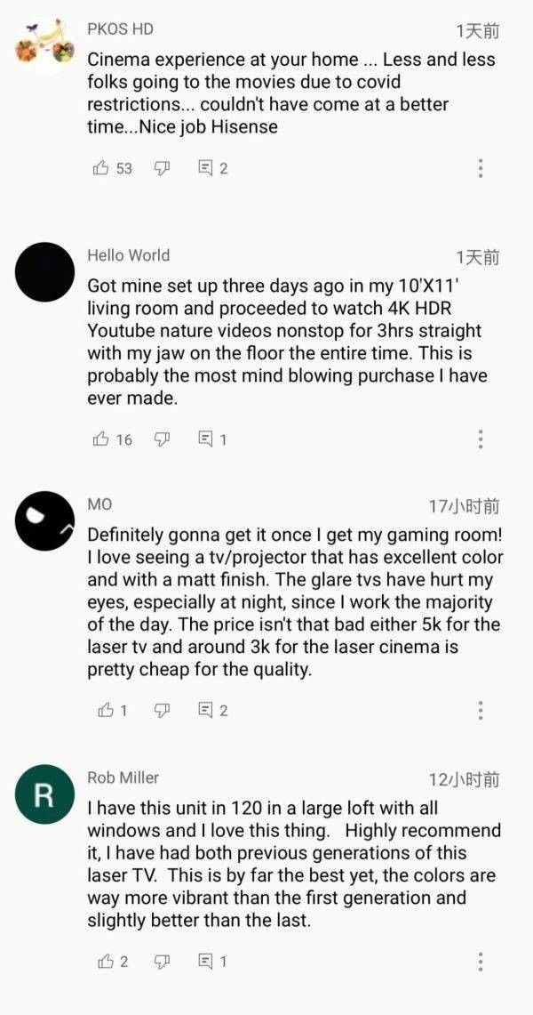 值得一提的是,关于海信激光电视的评测视频上传后,引起网友的广泛讨论。其中不乏海信激光电视的海外用户, “我也曾购买过前几代海信激光电视,L9G比前几代激光电视色彩更加鲜艳,体积更加娇小。非常推荐大家购买!” 一位海信激光电视的忠实粉丝在评论区说。另一位海信激光电视用户写道:“三天前我的激光电视在客厅里安装好了,我连续三小时使用它观看YouTube上的4KHDR视频,在整个观看过程中我的下巴一直在地板上!L9G可能是我买过最令我惊喜的产品了!”