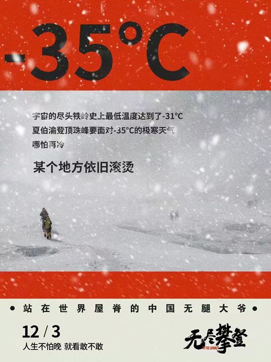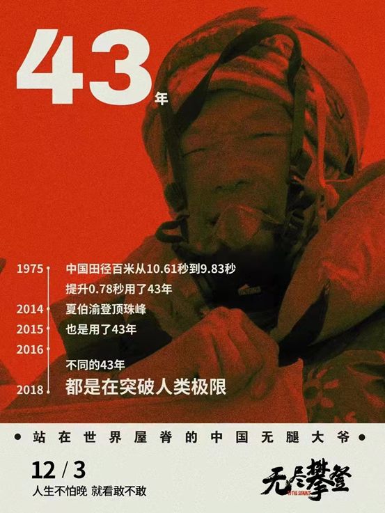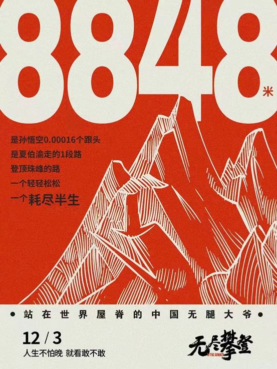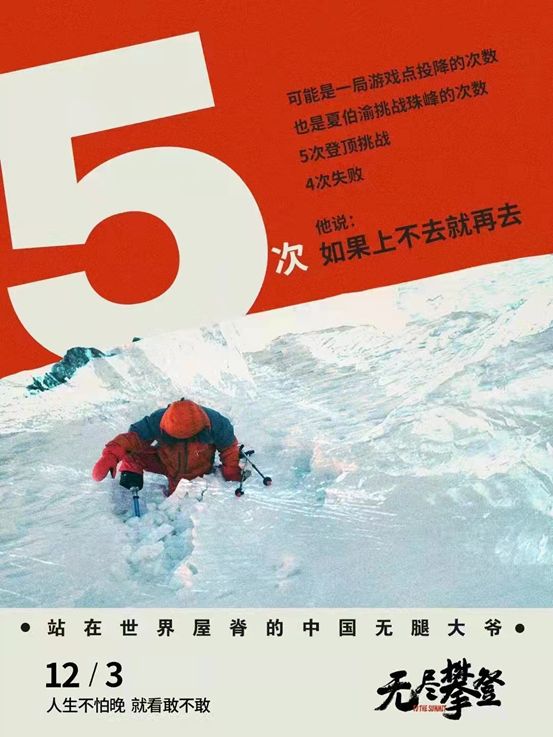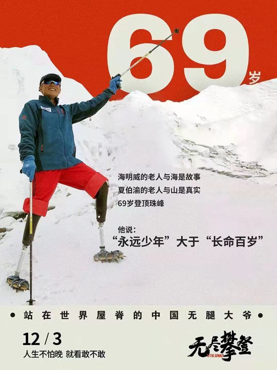2021年12月3日,电影《无尽攀登》正式上映,希望可以与您共同见证这段动人心魄的攀登之旅,与中国无腿登顶珠峰第一人、华耐登山队荣誉顾问夏伯渝和华耐登山队一起无尽攀登,顶峰相见。