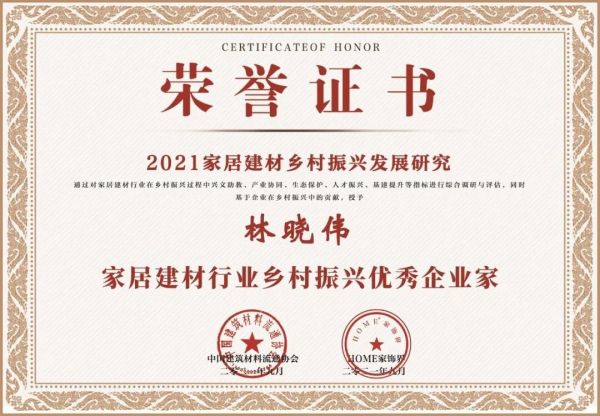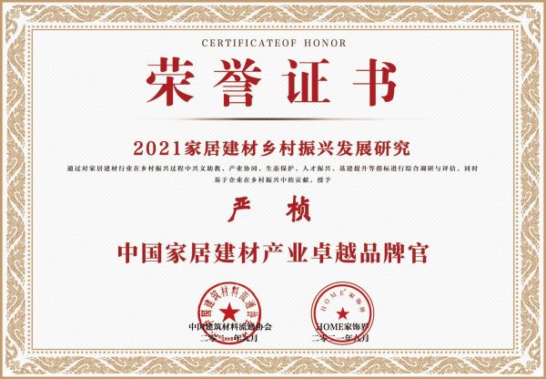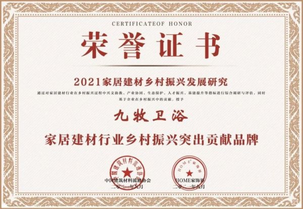 9月13日,2021家居建材乡村振兴发展研究通过对家居建材行业在乡村振兴过程中兴文助教、产业协同、生态保护、人才振兴、基建提升等指标进行综合调研与评估,同时基于九牧在乡村振兴中的贡献,授予九牧“家居建材行业乡村振兴突出贡献品牌”荣誉,九牧研发总裁林晓伟荣获“家居建材行业乡村振兴优秀企业家”!九牧品牌总裁严桢荣获“中国家居建材产业卓越品牌官”!