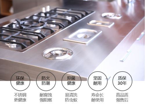 1、基材优势中餐烹饪高温高湿高油烟,不锈钢厨柜环保、防水、防火、耐刮、抗腐蚀、高寿命、易清洁,比传统木质橱柜更坚固、更健康。