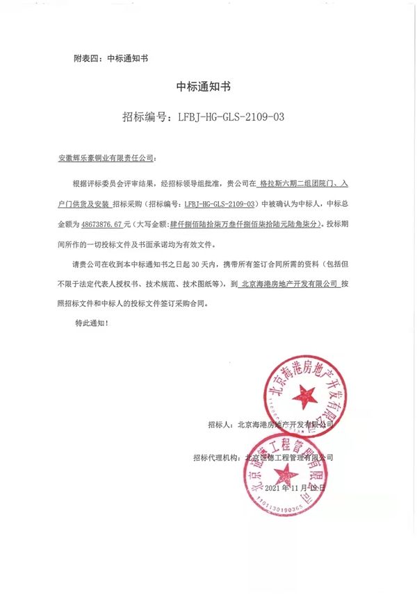近日,安徽辉乐豪铜业有限责任公司传来中标喜讯,公司经过与众多同行公平竞标,最终以48673876.67元中标北京通州区高端别墅小区“鲁能格拉斯六期入户门项目”。