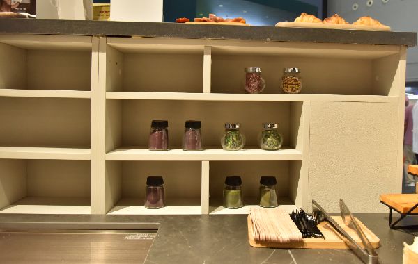 岛台前方内置储物升降设置,日常洗涤消毒后的碗筷、常用的调味料可收纳其中,取用更方便,隐藏式收纳更人性化。
