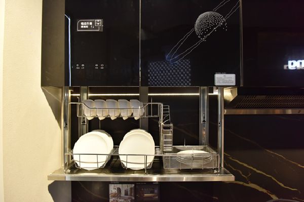这款领尚橱柜在功能定制上也别具一格,更显高端大气,智能升降系统与智能消毒清洗等功能设置则让人相当惊喜。