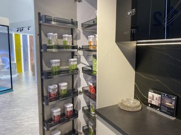 大怪物连门拉篮,通过隐藏式的设计对橱柜整体空间进行了巧妙分割,超大的储存空间令分类更加轻松便捷,也令厨房更加整洁美观。