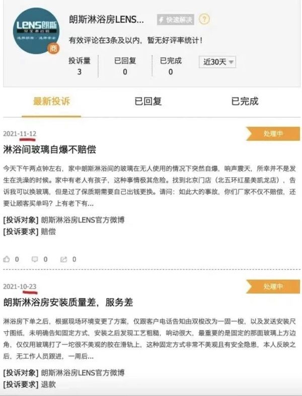 新浪定制频道讯 近日,有消费者投诉朗斯家居:朗斯产品有严重质量问题,安装问题,但却迟迟不作出处理。据了解,该商家还涉及11月12日主题为“淋浴房玻璃自爆不赔付”、10月23日主题为“朗斯淋浴房安装质量差、服务差”两条投诉状态显示为“处理中”。