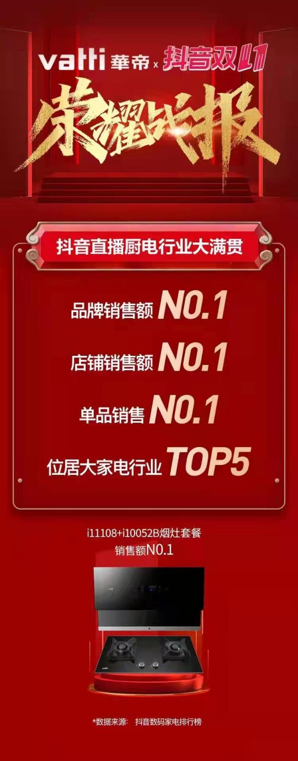 11月11日当天,华帝京东自营累计销售额破 1 亿大关,增长率位居行业第一;抖音直播则实现多项第一:品pai销售额第一、店铺销售额第一、单品销售额第一,并位居大家电行业第五。其中,i11108+i10052B烟灶套餐更是成为了抖音厨电行业烟灶套餐销售额第一的人气爆款。