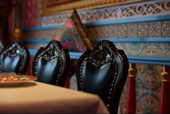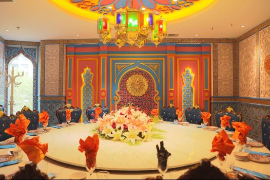 【宋涛】我们在作案的时候,当时亲临了新疆的各个地方,我们做了考察,包括色彩,包括所有的这种造型,包括你入口的进入,个人的体验,包括西域文化的这种创造,包括每一个造型,我们都是按1:1最原始的东西来去把它拿过来,然后根据我们的手法去改造,再结合现在的这种流行的趋势,打造一个网红的餐厅,让大家更多的了解新疆的城市的美。因为这个案子他有好几个分店,对于这个分店来讲,打造的就是一个可以打卡的地方,让大家知道在新疆还是有彩色的,所以说在这个案子里头呢,包括每一个细节,顶上那一些镂空的花纹,包括这种桃形状的这种拱形的,包括很多地毯,瓷砖,都是从新疆或者从国外特意拿来的,选购符合这个空间的一些造型,来去演变。其实就几大板块,如果提到色彩的话,其实新疆就是以红,蓝,玫红,墨绿,白色,黑色,金色,基本上就是七八个颜色,你比如说白色那就是雪山,有可能你的红色代表那个鲜艳的水果,它很直观地看到颜色的分类,所以说我们希望把这颜色组合到一块儿去做这么一个案子。其实这个是非常非常难的,因为在好多做新疆餐厅的时候,你拿到这个案子的时候你会发现,你必须把它做到更加的去像那个城市的东西,有可能别人认为只是一个造型而已,但是作为我们来讲,我们希望把哪怕一个柱子,哪怕一个造型,希望能让它做得还原度更高一些,所以说费了很大的功夫。