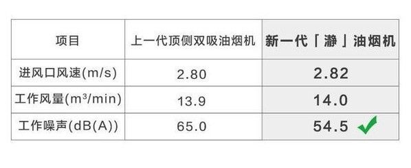可以看出,A.O.史密斯新一代“瀞”油烟机风量与上一代顶侧双吸油烟机相当,但噪声大幅降低。