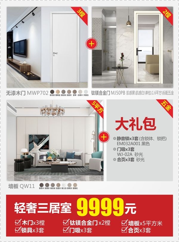 该全屋定制套餐是根据三房一厅两卫来定制的,套餐包含无漆木门3樘,钛镁合金门2樘,锁具3套,门吸3套,合页3套,时尚墙板5平方米;