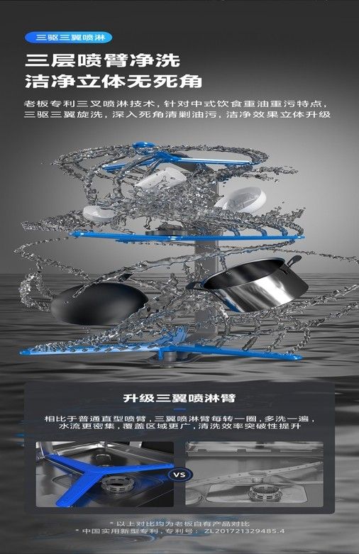 疫情的反复出现,也让更多人关注到饮食健康这一话题。老板洗碗机针对困扰年轻人的洗涤问题升级产品,由双层三叉升级为三层三叉,转1圈多洗3遍,更洁净也更有效率,与普通直形喷淋臂相比,三叉鲸喷淋臂水流密度更高,覆盖更广,洗涤效果更好,再加上360度立体的喷淋系统,更可深入餐具死角,从而达到超强的洗净效果。
