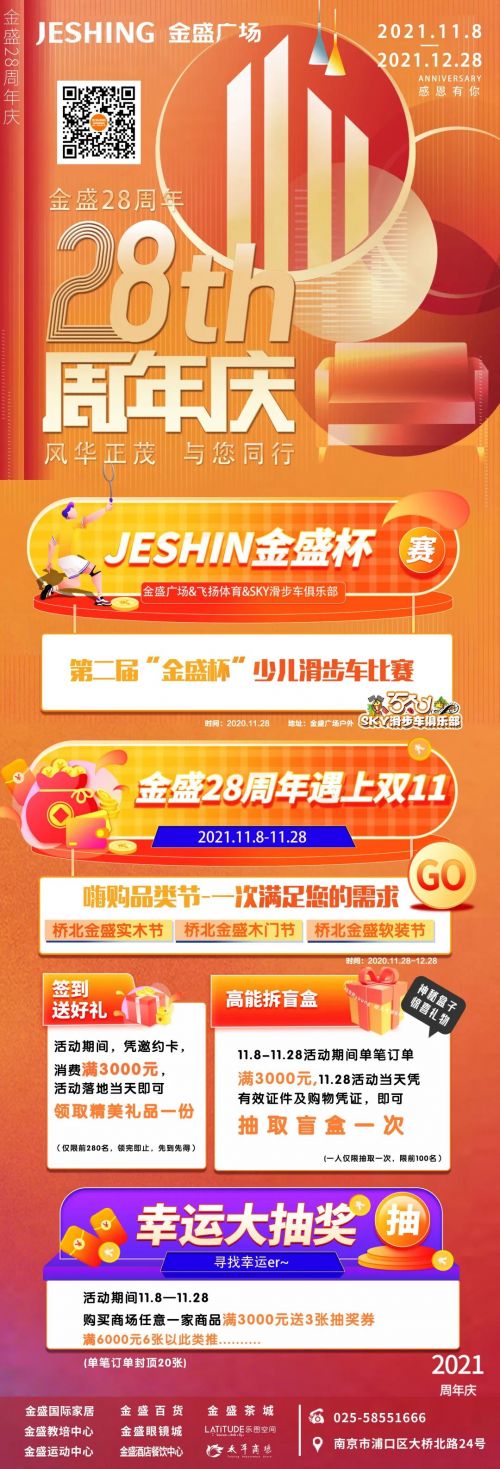桥北金盛启动金盛28周年庆生季,为致谢陪伴了28载的消费者,桥北店推出年度超值福利“28周年庆特权”。