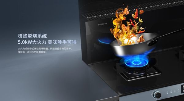 烟机模块采用由三防电机、双进风特氟龙叶轮与第五代一体静音风道组成的双劲吸系统,双倍进风、更快净烟,带来更持久畅快的油烟吸排体验;灶具模块采用极焰燃烧系统,5.0kW大火力成就中式烹饪美味精髓,快速锁住食物营养,美味唾手可得。