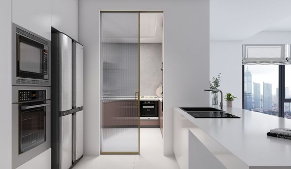 餐厨空间适宜使用隐藏式全景门。现代厨房设计,通常将中岛吧台与餐桌相连,兼顾厨房与餐厅的作用,走动更频繁。因此,采用隐藏式全景门,不仅提升厨房格调,同时长虹玻璃不透视的效果,也能很好地遮挡中厨区可能带来的凌乱感。