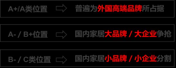 在当前红星美凯龙、居然之家、月星家居为代表的集中化渠道,一是,A+/A类位置,普遍为外国高端品牌所占据;二是,A-/B+位置,国内家居大品牌/大企业争抢;三是,剩下的B-/C类位置,才是被国内家居小品牌/小企业分割。