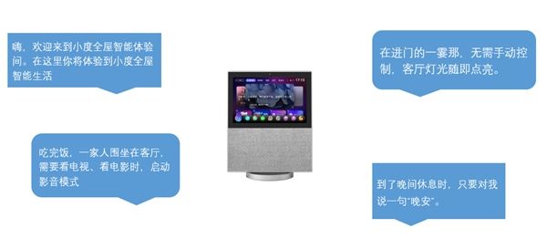 小度全屋智能自主介绍。小度自主语音介绍,自主执行设备控制,无需店员讲解就能完成标准化的用户介绍体验任务。既节省了人力成本,又保障了用户体验的完整性,不会因为人员培训不到位影响用户体验,而人工介绍则辅助解答用户的非标准化问题。