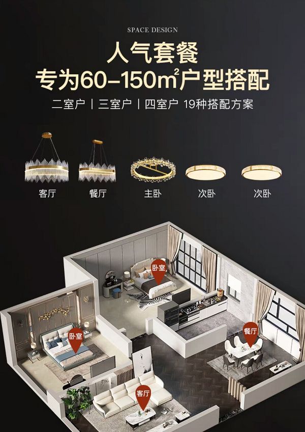 2.三室两厅轻奢套餐,无极调光,智能随心调高纯度A级水晶玻璃,光效璀璨;高透光PMMA灯罩,明亮不刺眼。