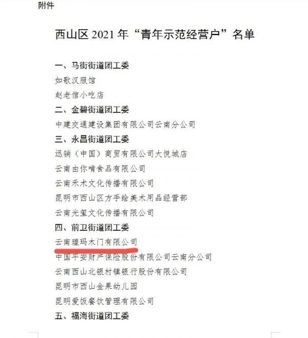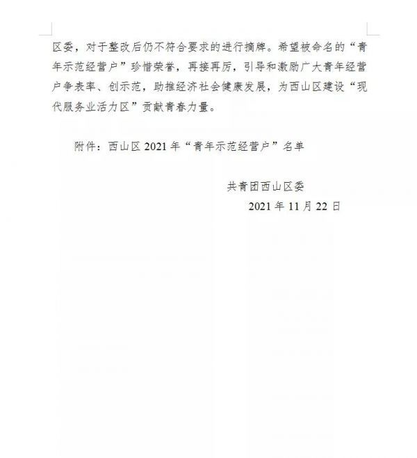 获评2021年昆明市西山区“青年示范经营户”,为西山区建设“现代服务业活力区”贡献青春力量,助推经济社会健康发展。