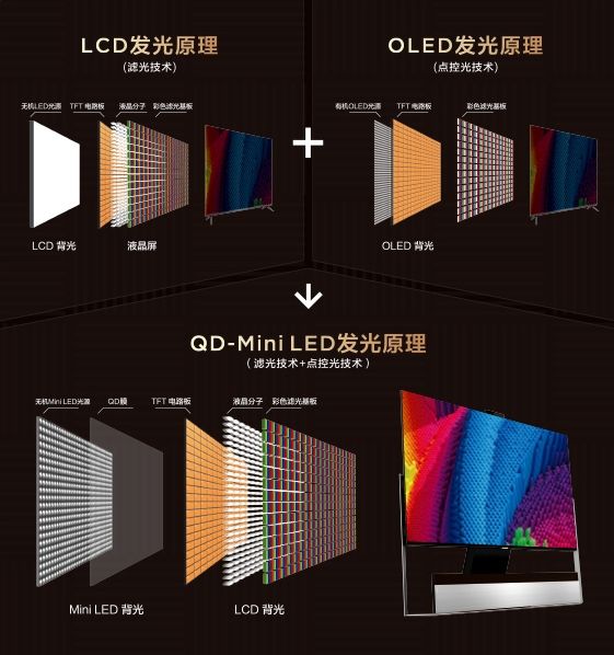 当然了,TCL之所以能在Mini LED领域取得全面领跑,不仅仅在于研发布局上的“快人一步”,更重要的是因为TCL QD-Mini LED技术与普通Mini LED技术并不相同——TCL QD-Mini LED懂得做“加法”。我们都知道Mini LED技术是结合了LCD与OLED的显示技术优势,将面光源升级为像素级点光源,但在此基础上,TCL QD-Mini LED还同时沿用了领跑全球的QLED技术,在实现超高对比度的同时,拥有比OLED更高的亮度、色域以及寿命,是真正的下一代大屏显示技术。