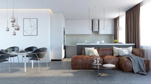 步入厨房,深灰色地面的映衬下,原色、白色板材的搭配,让空间更加别致而富有质感,三种颜色形成秩序感的层次划分,自然光线下呈现静谧的氛围。